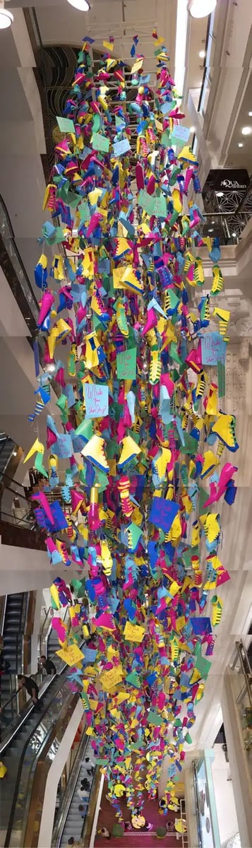 "What’s your Shoe Story" was the title given to the project by the Selfridges design team to celebrate the launch of the newly refitted shoe department. Minki Balinki created over 5,000 shoes to fill the Oxford Street Stores Atrium. The shoes where created using the natural resistance of the material that would physically bend into place creating curved shapes and fixed into position using paper fasteners. We created 6 types of shoe and each shoe was in 6 different colourways that where printed in brightly coloured inks and die cut in there 100's. Colours where briefed in to reflect a pop art feel and be very playful. The shoe types we created included a wedge sandal, high heel, brogue and trainer both of which we threaded up with oversized laces. The installation was to be completely random in colour way and shoe type. The overnight installation was compleated by 22 people on the floor faith fully clipping on the shoes to the pre prepared rigging lines while 8 riggers in the roof looked after the truss rising.